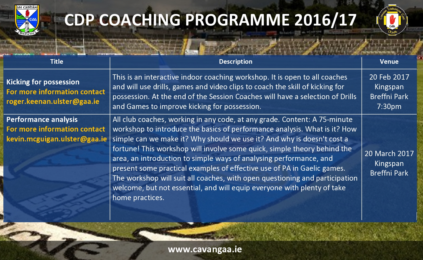 For more information about any of the CDP Workshops, please email coachingadmin.cavan@gaa.ie with your query.