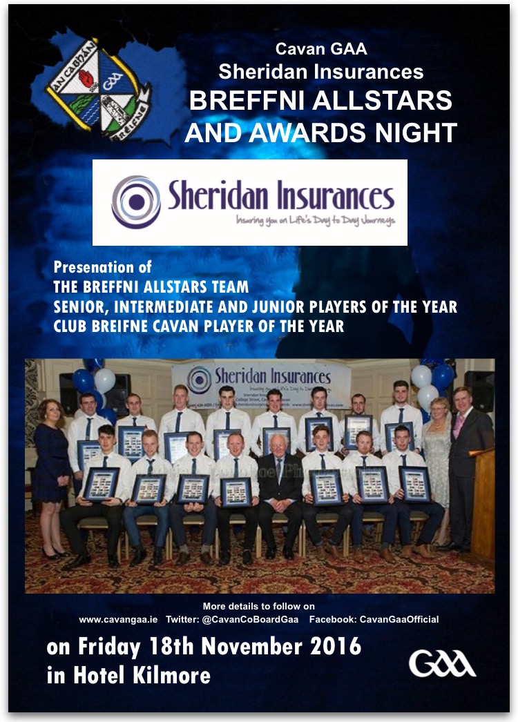 The Sheridan Insurances Cavan GAA Breffni Allstars & Awards Banquet will take place on Fri 18th November in Hotel Kilmore.