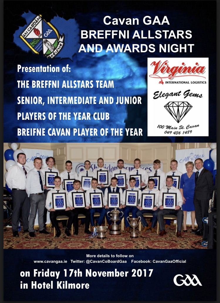 The Senior, Intermediate, Junior and Minor Players of the Year will be announced as well as referee awards, Hurling Player of the Year and the Club Breifne Cavan County Player of the Year for 2017.