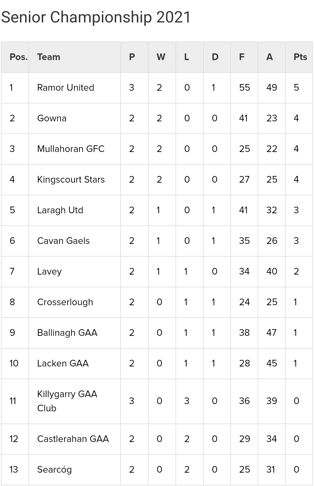 Kiernan’s Service Station Senior Football Championship Table after Round 3
