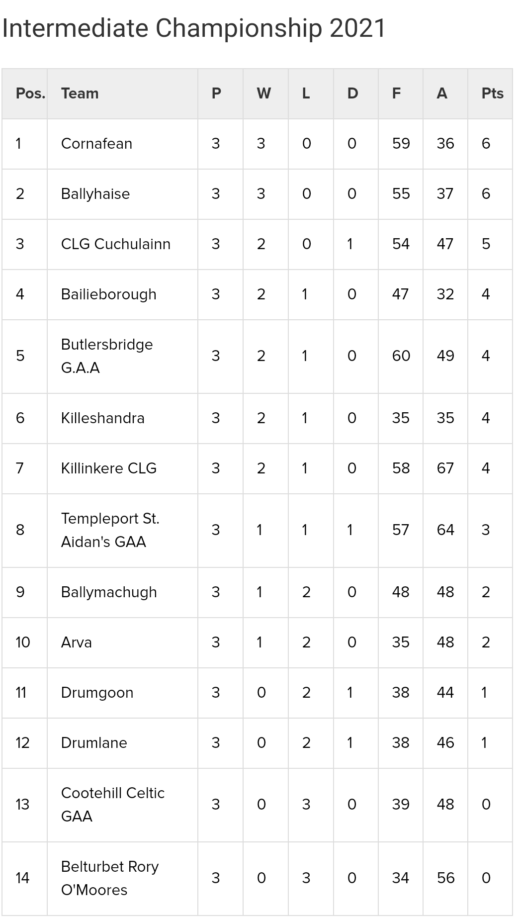 McEvoy’s SuperValu Virginia Intermediate Football Championship Table after Round 3