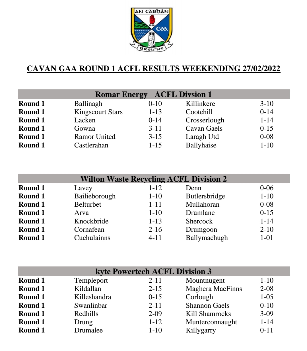 Cavan GAA Round 1 ACFL and Reserve ACFL Results