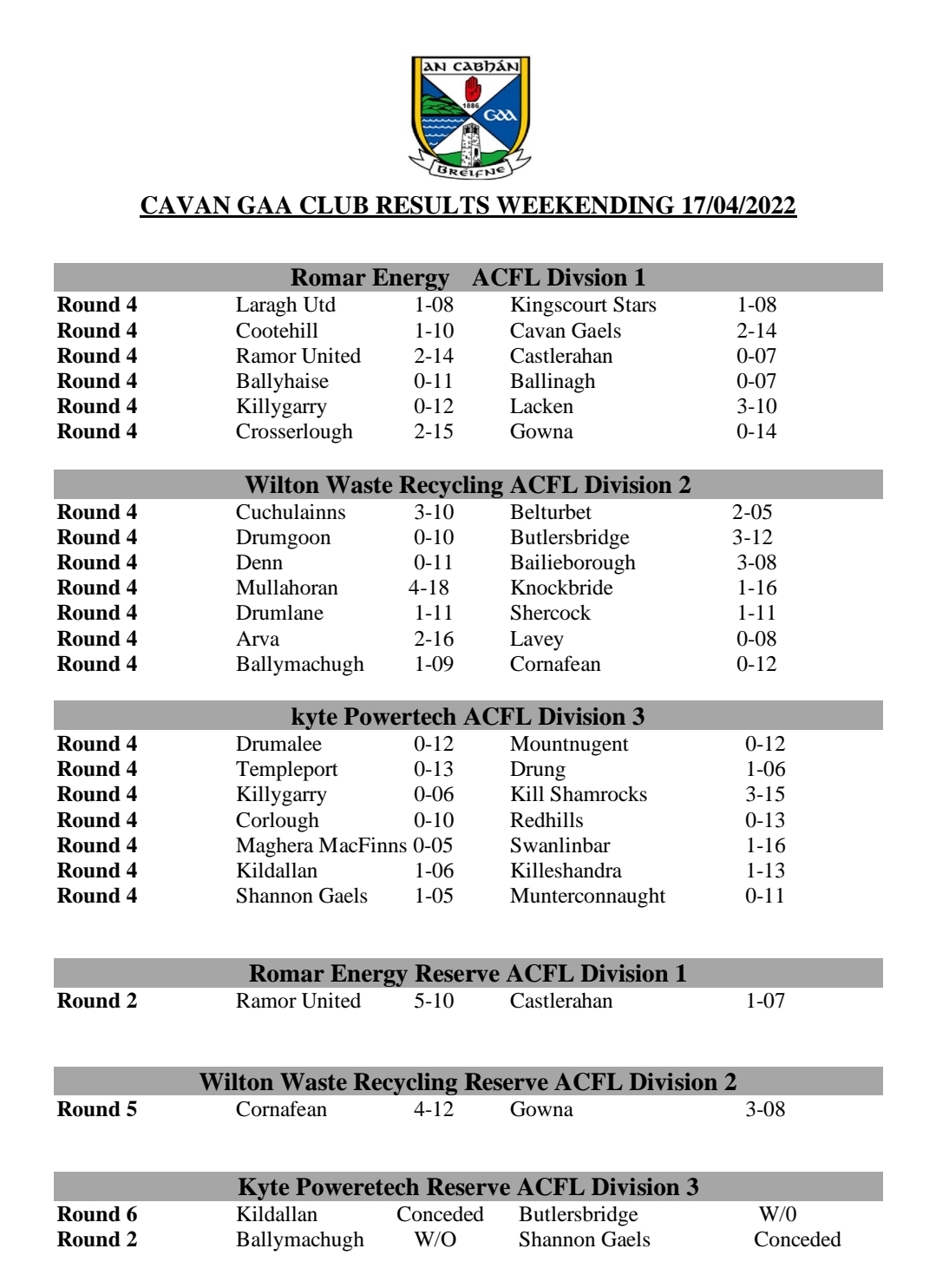 Cavan GAA Club Results weekending  17/04/22
