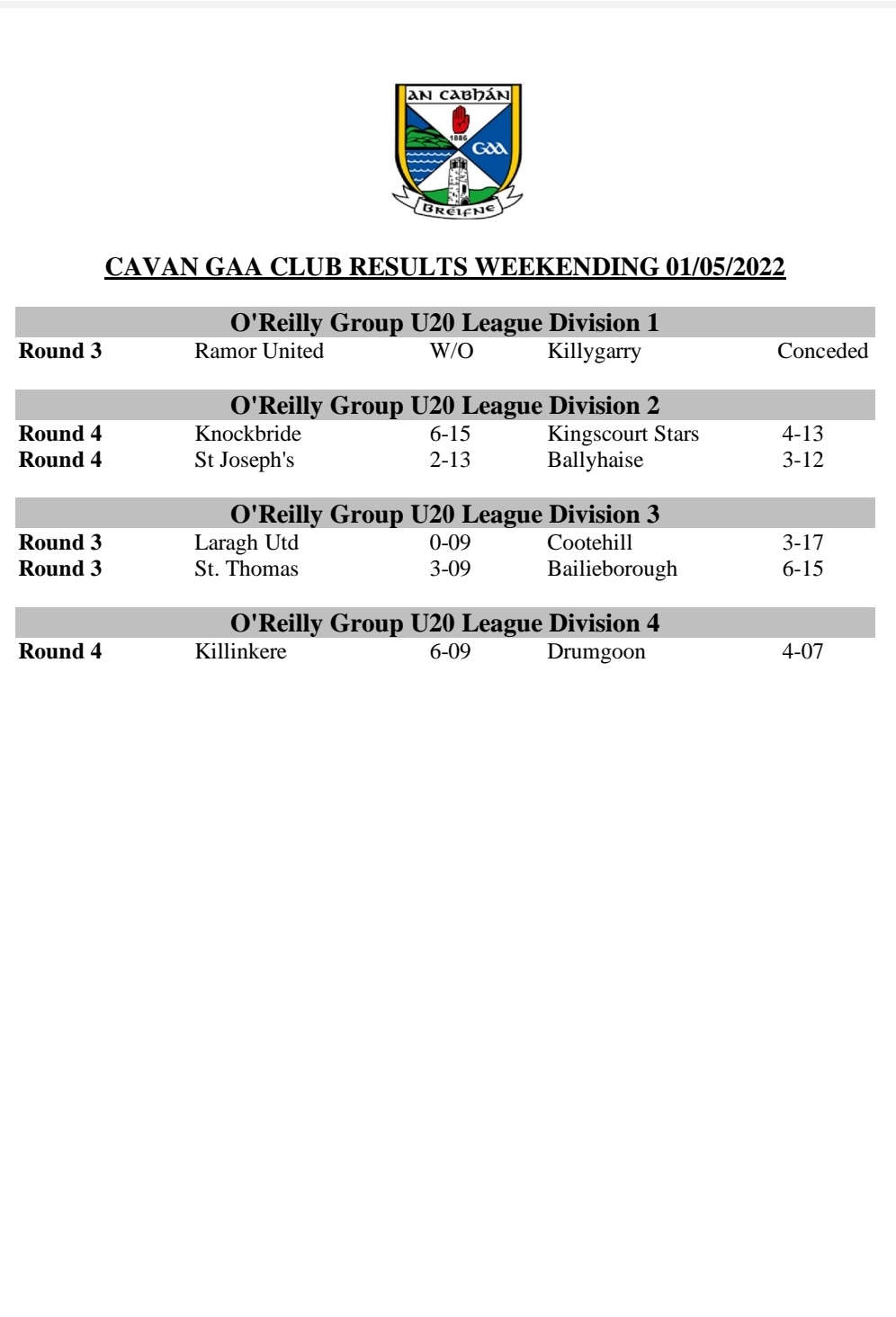 Cavan GAA U20 Results and Tables Weekending 01/05/2022