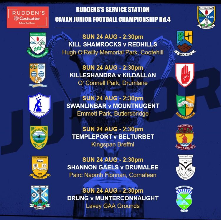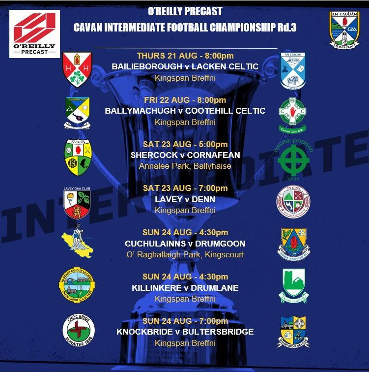 The Cavan Club Football Championship continues this weekend with games in the O’Reilly Precast Intermediate Championship Rd 3 & the final round of the Rudden’s Service Stations Junior Championship.