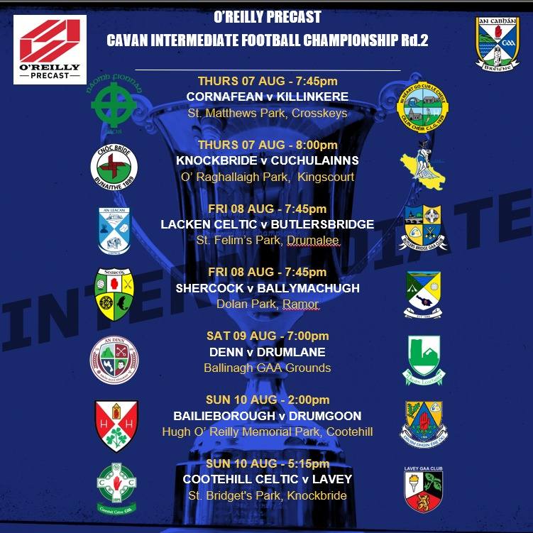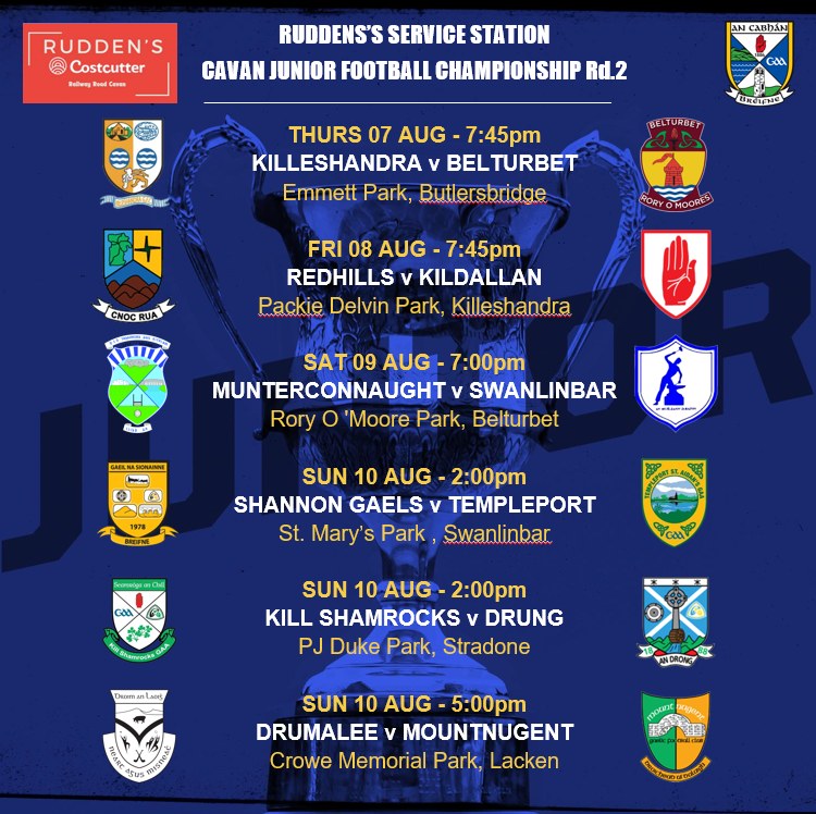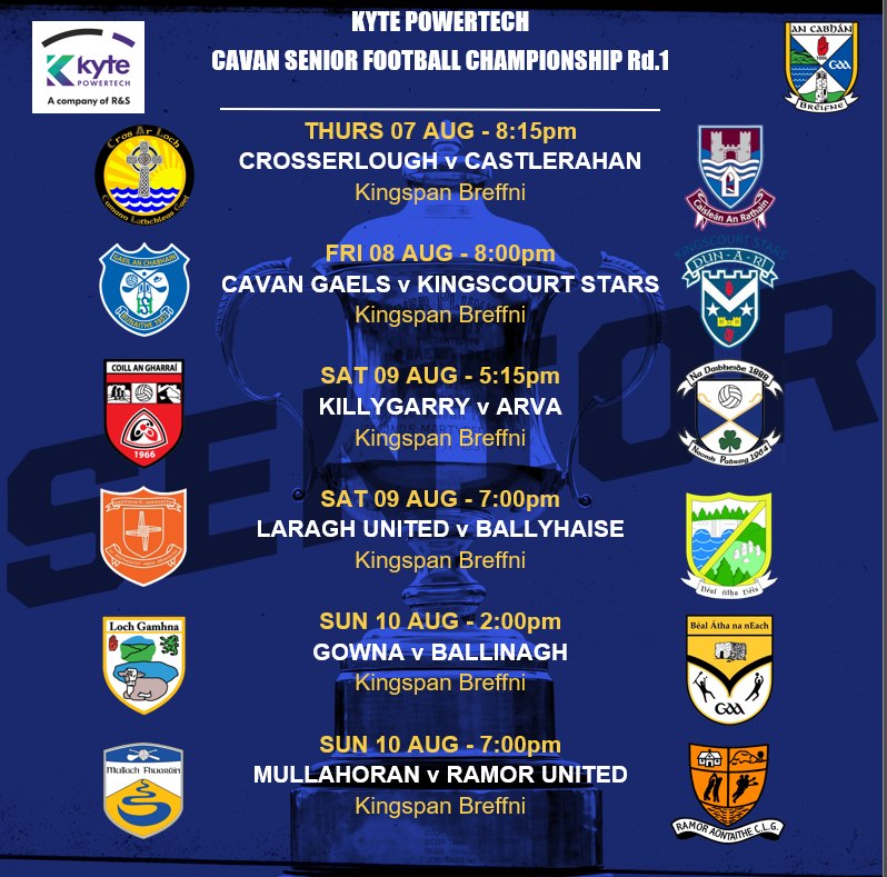 The Cavan Club Football Championship continues tonight with games in the Kyte Powertech Senior Round 1, O’Reilly Precast Intermediate & Rudden’s Service Stations Junior Championship Rounds 2.