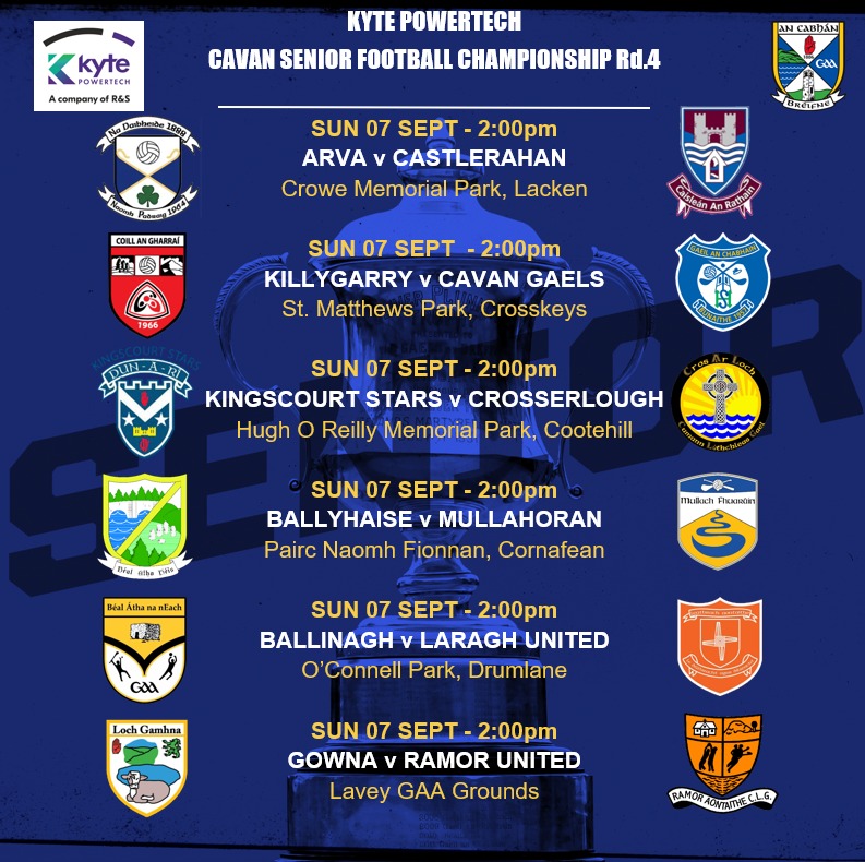 The Cavan Club Football Championship continues this weekend with the final round in the Kyte Powertech Senior Championship, the quarter finals in the O’Reilly Precast Intermediate Championship & Rudden’s Service Stations Junior Championship